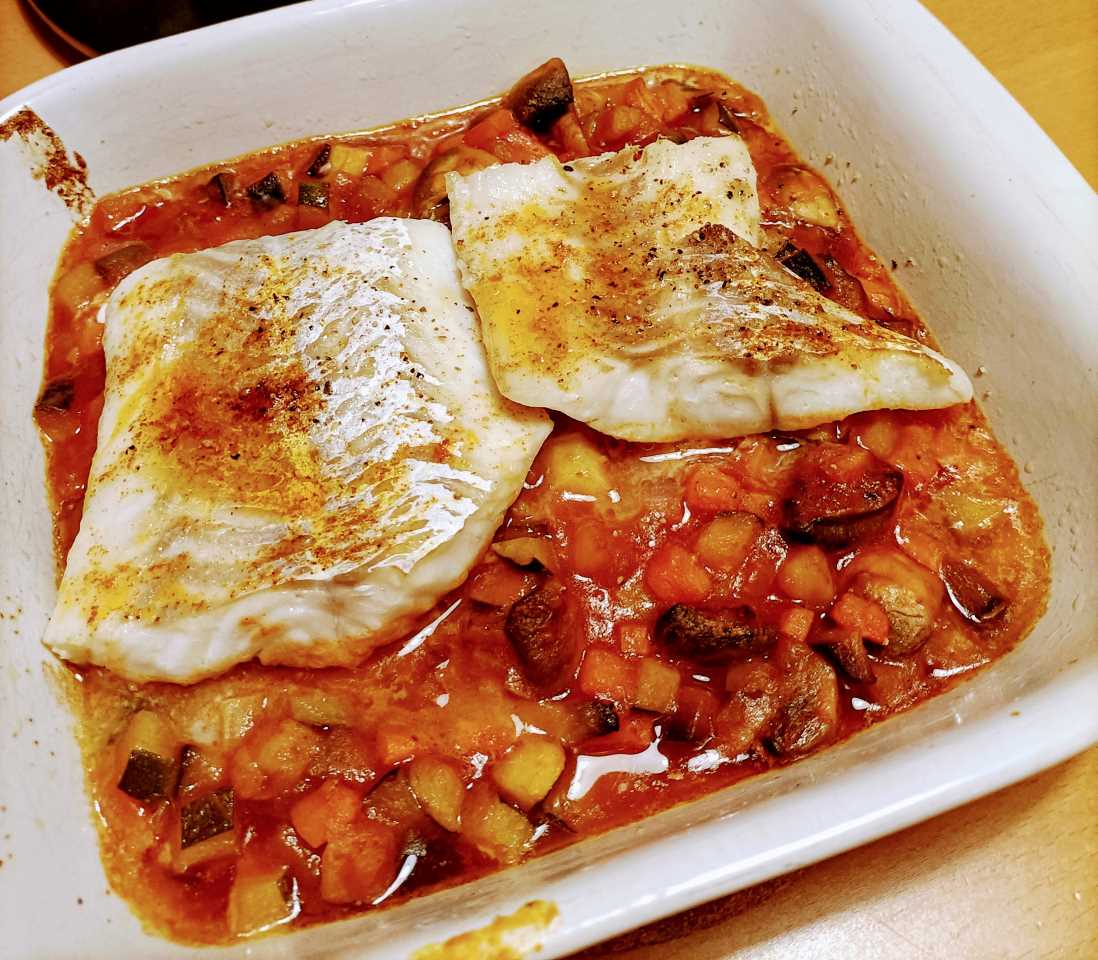 Kabeljauw met groenten in tomatensaus in de oven