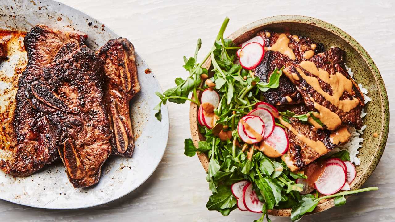 - 3. Heat a large heavy skillet, preferably cast iron, over medium-high. When pan is hot, add 2 tsp. oil and swirl to coat. Cook half of ribs without turning until underside is very dark brown and charred in spots, about 2 minutes. Turn ribs and cook until second side is golden brown, 1–2 minutes. Transfer to a plate. Repeat with remaining 2 tsp. oil and remaining ribs. Let rest 5 minutes.