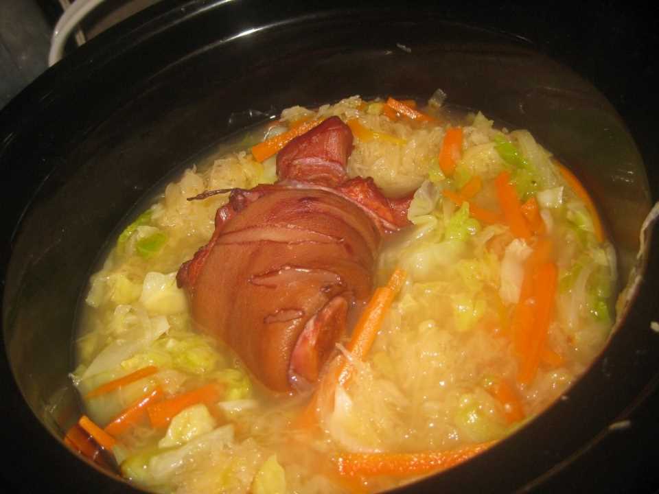 - The easiest is to throw in a couple or three of slices of bacon, cut up. It works well. I have used smoked pork hock (too much trouble for too little benefit) and in my latest stand-alone version I put in about a pound and half of pork roast, cut into cubes and browned.