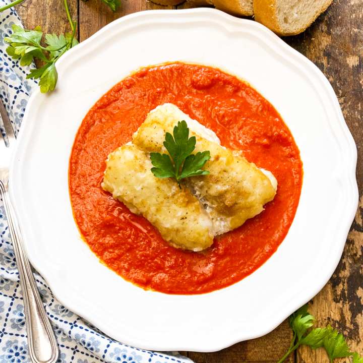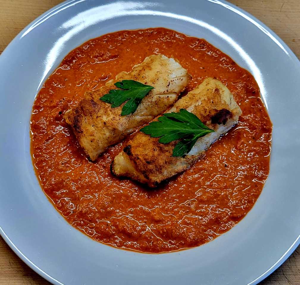 - Transfer the simmering pepper sauce into plates, add the cod fillets over the sauce and garnish with fresh parsley, enjoy!
