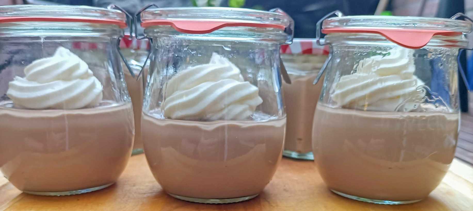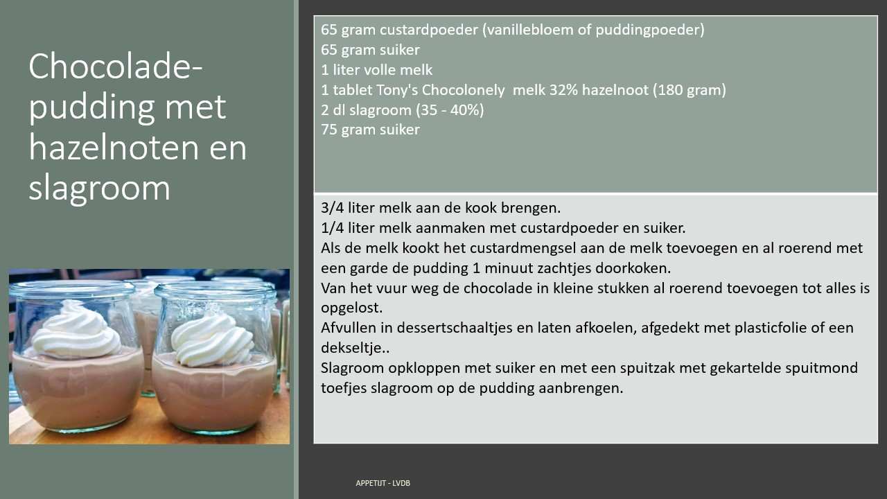 - Afvullen in dessertschaaltjes en laten afkoelen, afgedekt met plasticfolie of een dekseltje..