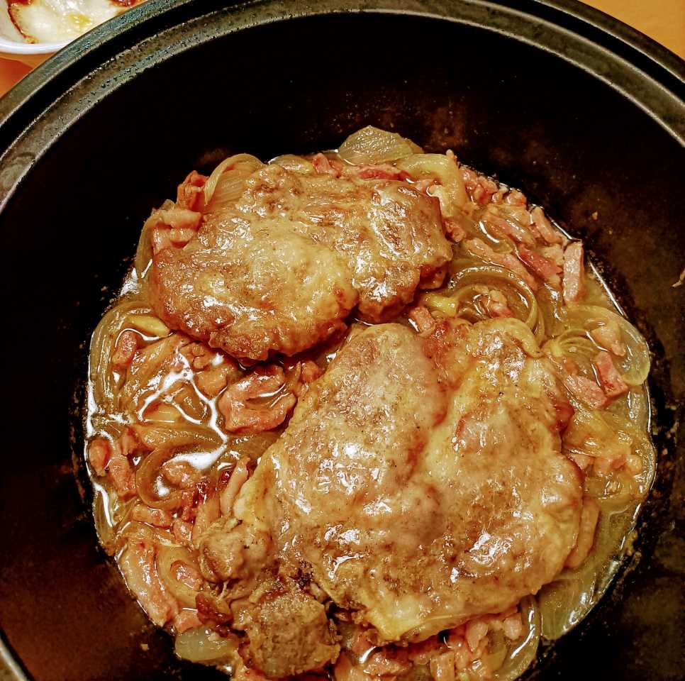 - Haal de karbonades uit de pan en bak de uien en spekblokjes aan in hetzelfde braadvet.