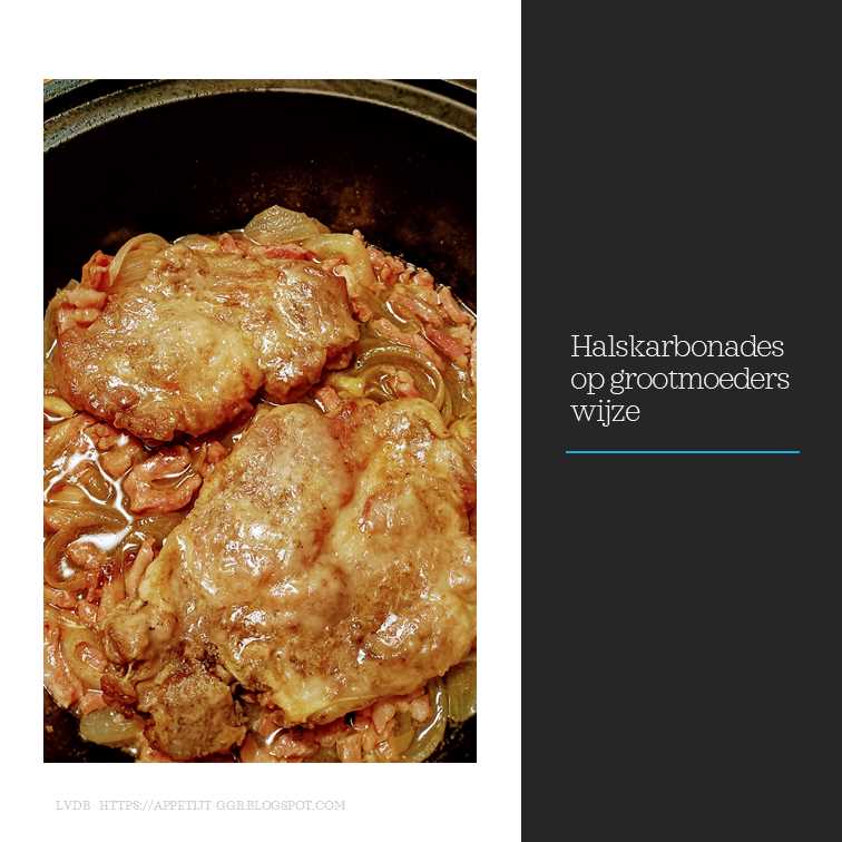 - Boter en olie verhitten in. liefst in een diepe gietijzeren pan en hierin de karbonades bakken aan beide zijden om ze een mooie kleur te geven.