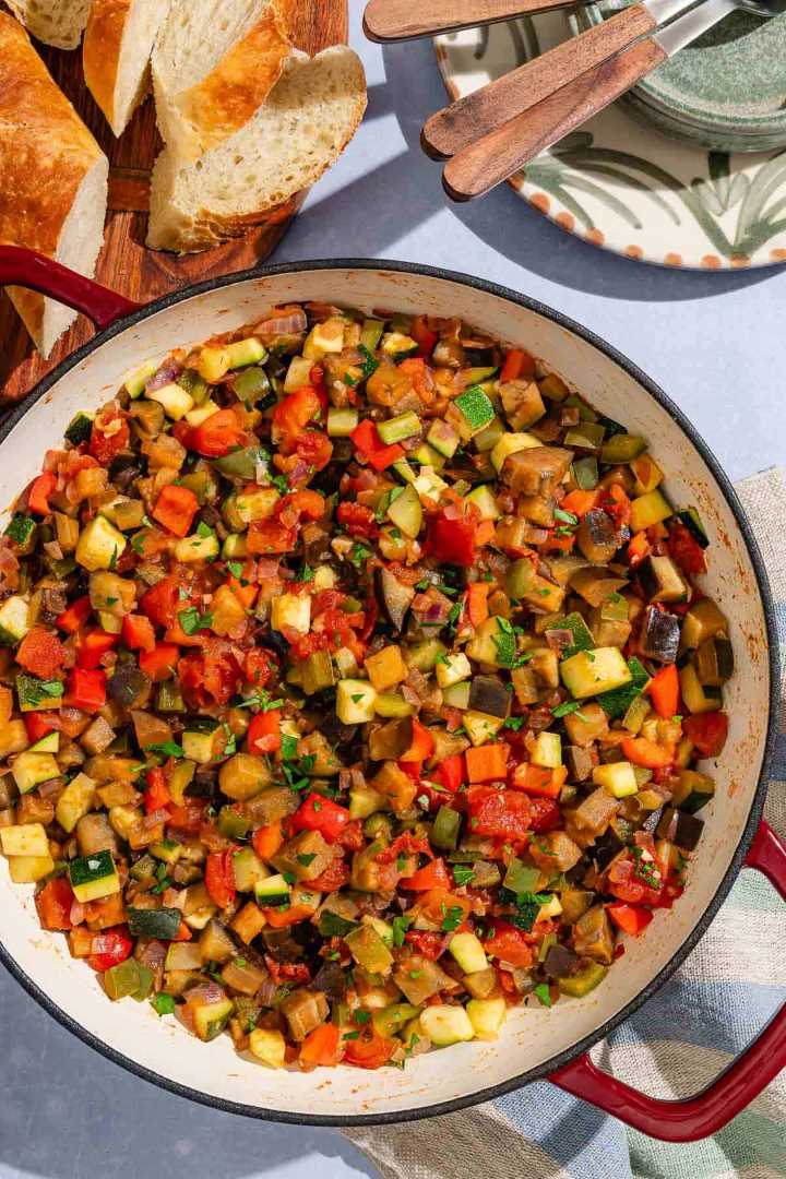 - Heat the olive oil in a large pan over medium-high heat. Add the onion and cook, stirring often, until softened, about 5 minutes. Keep stirring often as you add each vegetable. Add the bell peppers and cook for 4 minutes. Add the garlic and cook until fragrant, about 30 seconds. Add the eggplant and cook for 3 minutes. Add the zucchini and cook until the vegetables begin to brown, about 3 minutes.