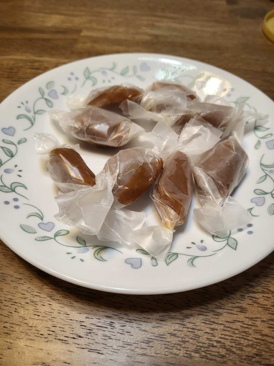 - Generously butter a 9x13 pan. In a 5 quart saucepan, combine everything except vanilla and cook to firm ball stage (248F). Stir in the vanilla; pour into prepared pan. Let cool, then cut into squares and wrap in waxed paper.
