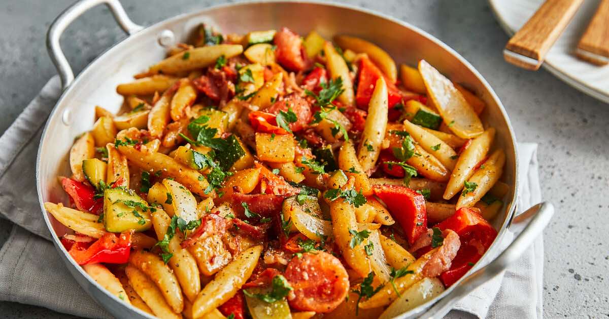 - 1. Für die Schupfnudelpfanne die Paprika vierteln entkernen und in grobe Würfel schneiden. Zucchini längs in 3-4 Scheiben schneiden und würfeln. Zwiebel schälen und in breite Streifen schneiden. Knoblauchzehe schälen und fein hacken. Die Cherrytomaten waschen und halbieren.
