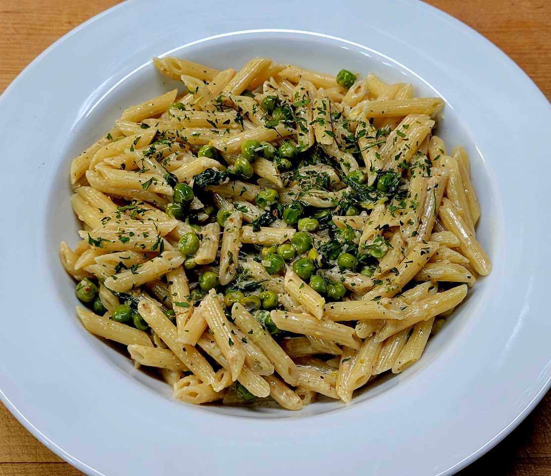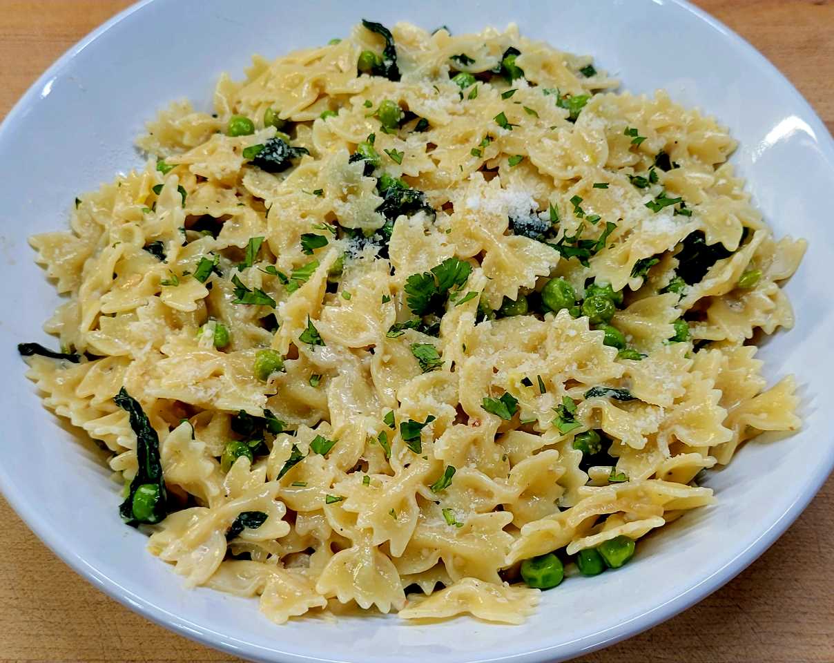 - Add the drained pasta to the skillet with the spinach and peas. Toss everything together, adding a bit of reserved pasta water if needed to help coat the pasta with the sauce.
