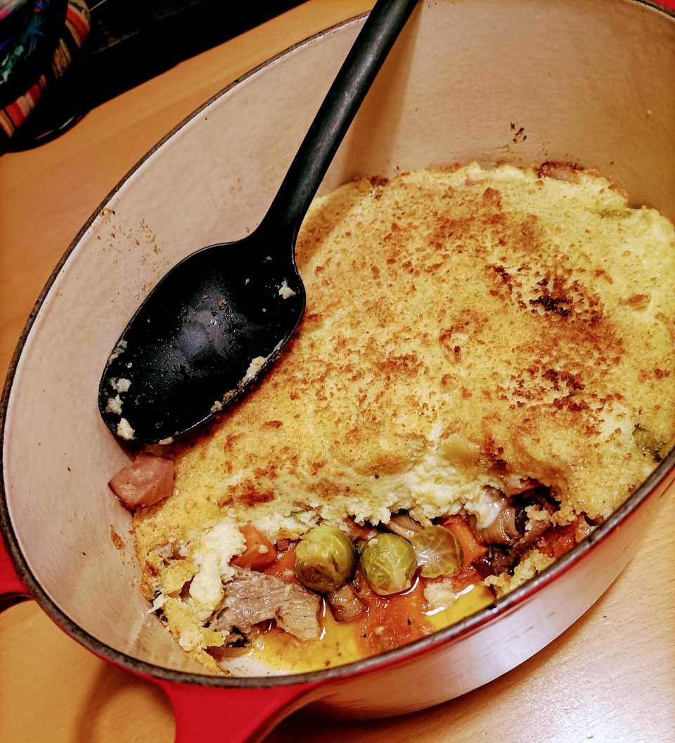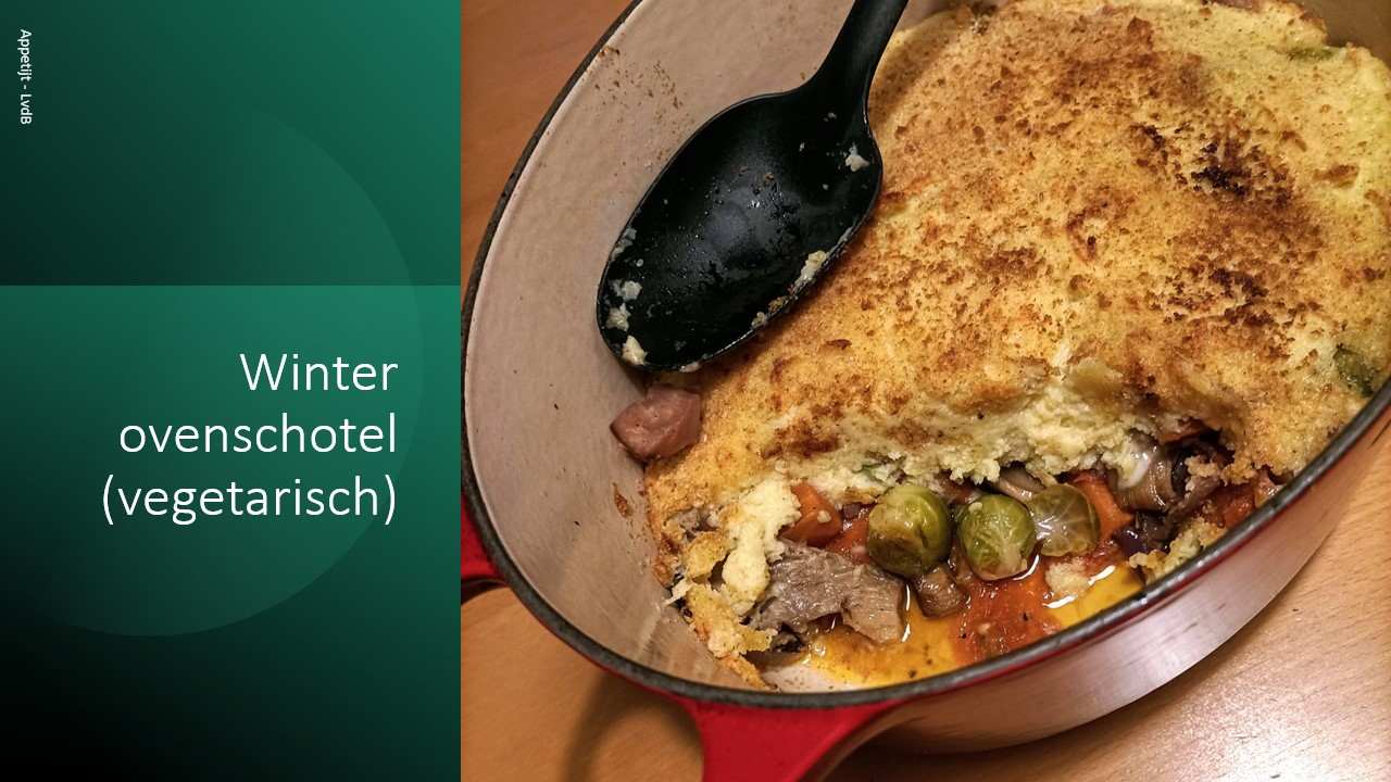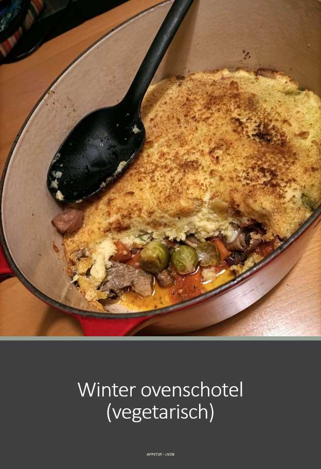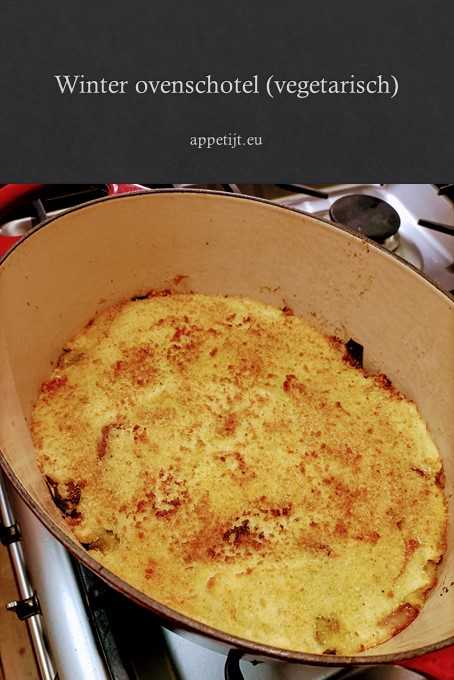- Een vegetarische ovenschotel met wintergroenten, rode wijn en aardappelpuree met kaas.