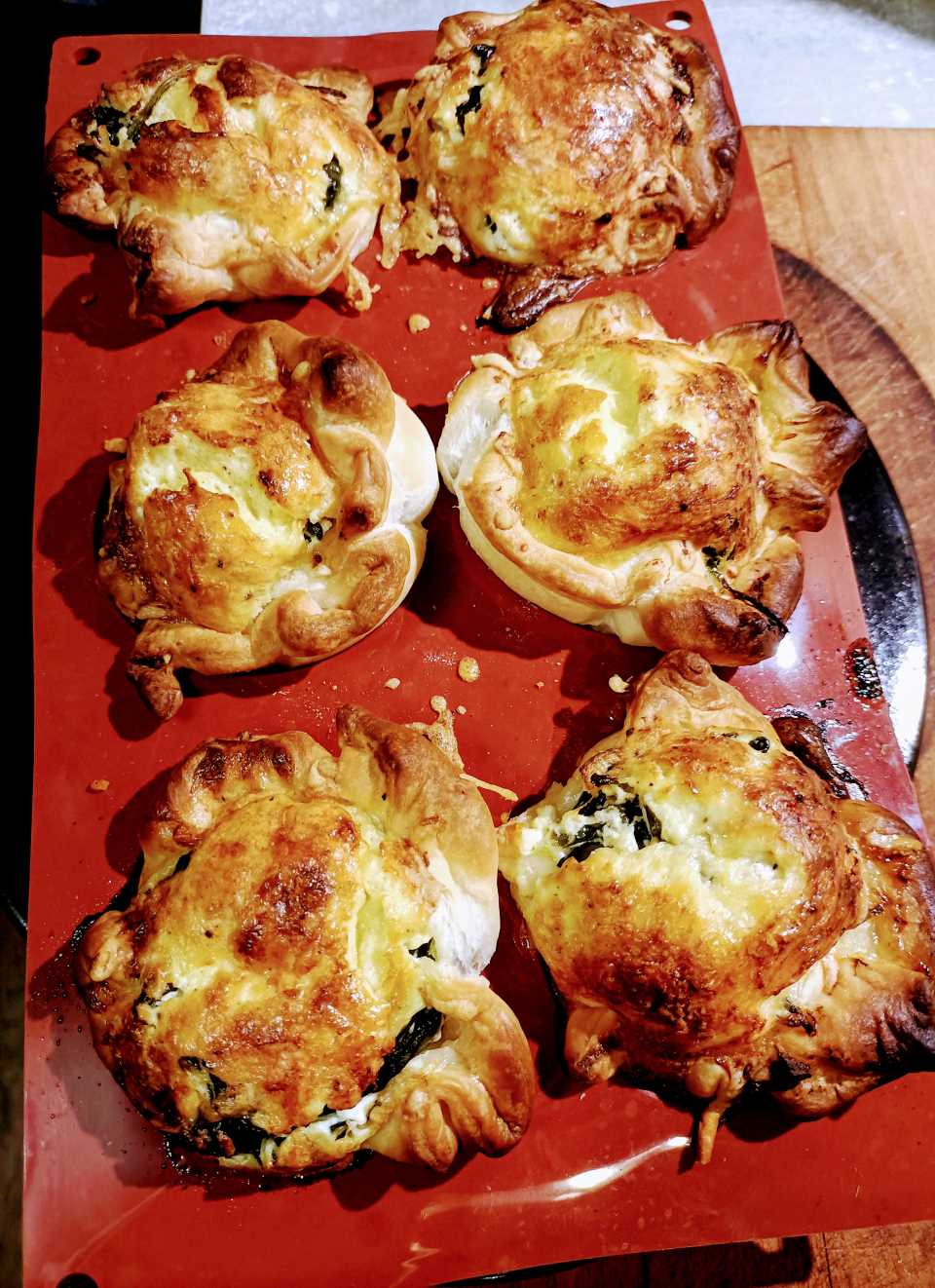 - Vouw voor iedere uitsparing het overhangende bladerdeeg wat naar binnen.
