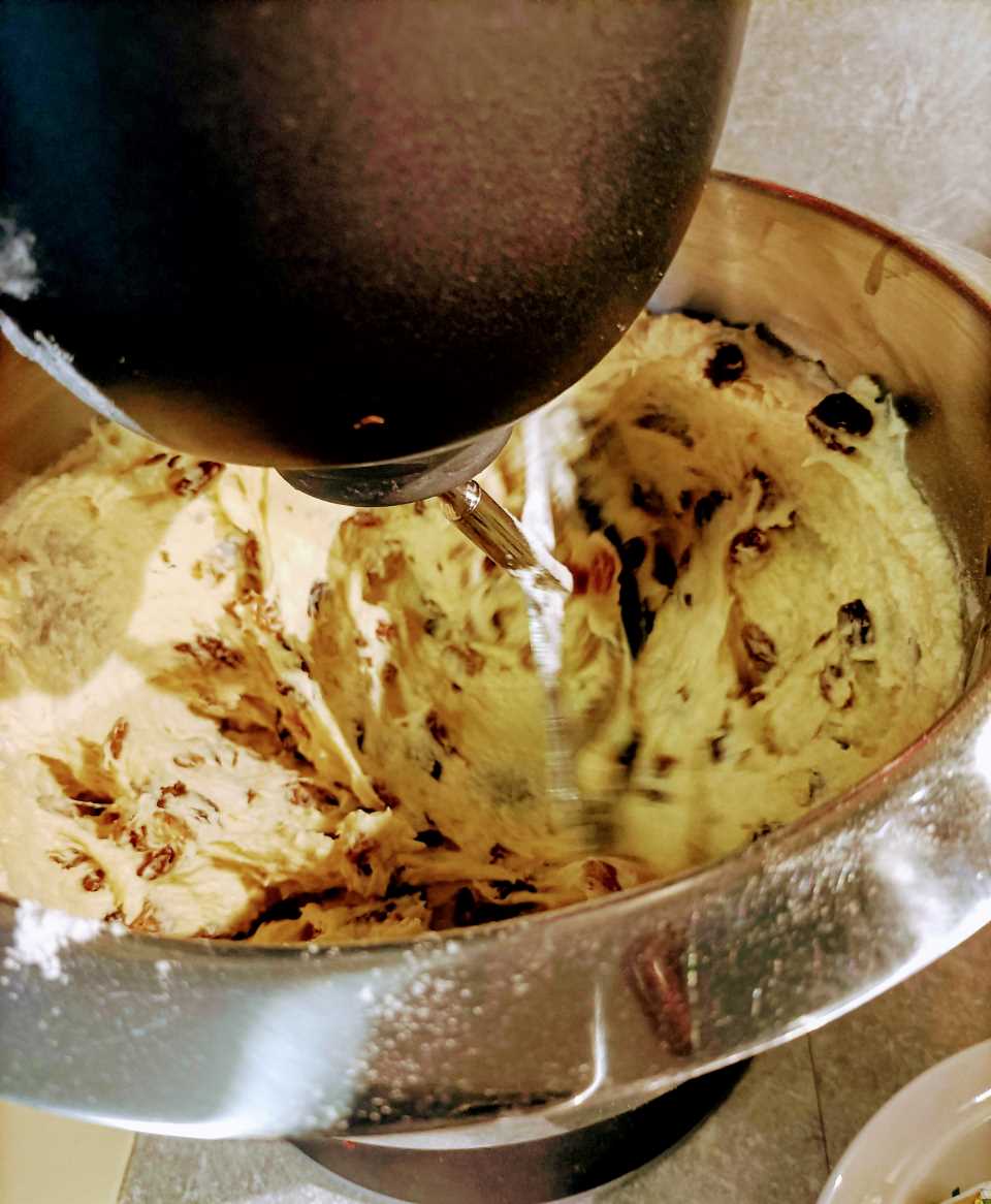 - Vervang de garde door het roerstuk, roer de bloem en daarna de uitgelekte rozijnen door het beslag.