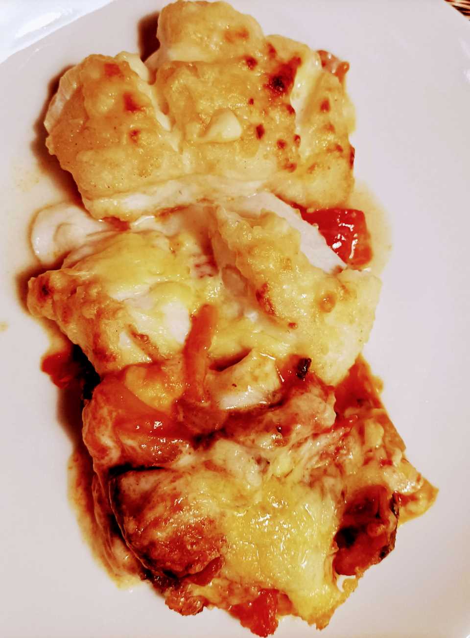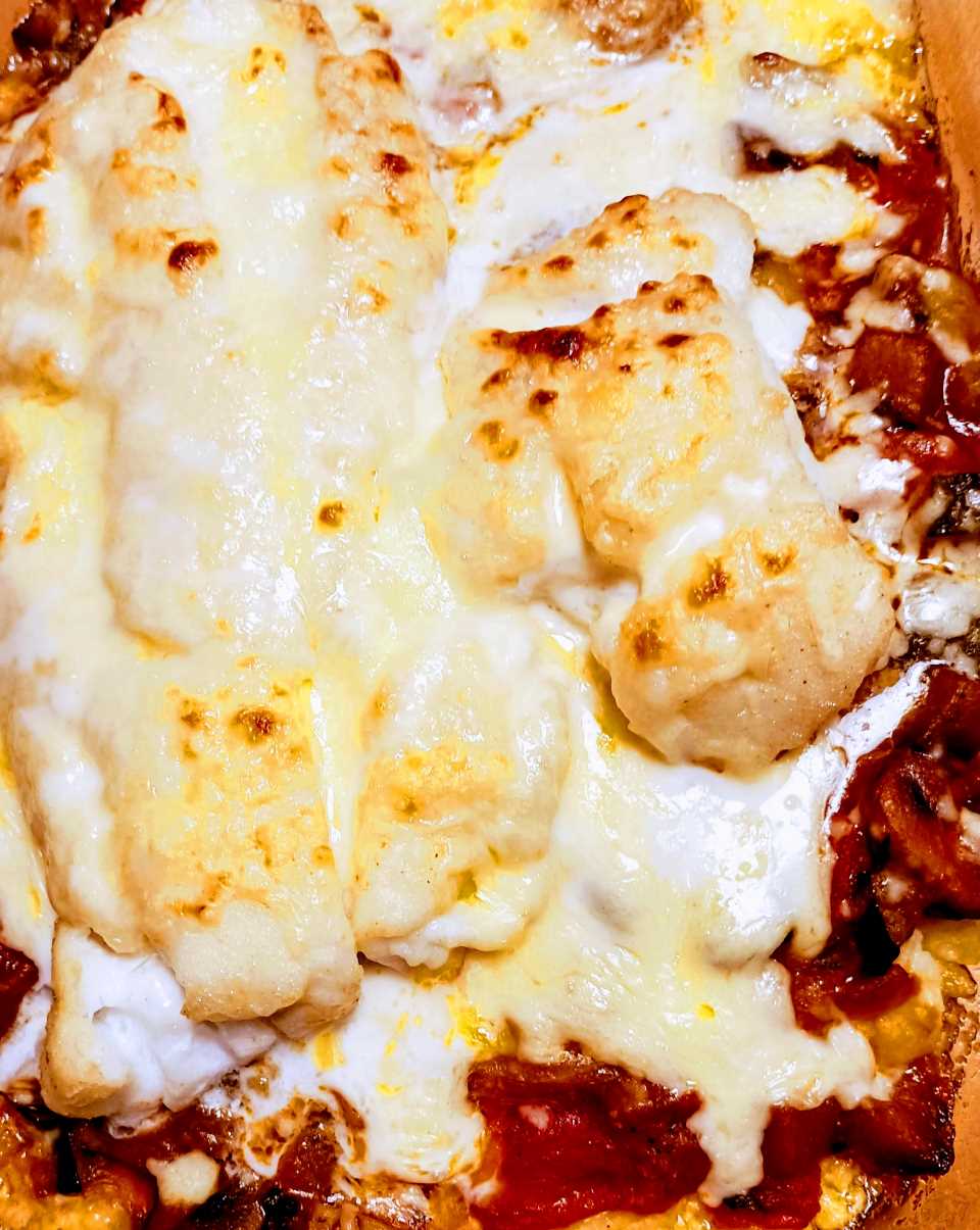 - Daarop het kabeljauwhaasje en de bechamelsaus, bestrooid met wat geraspte kaas.