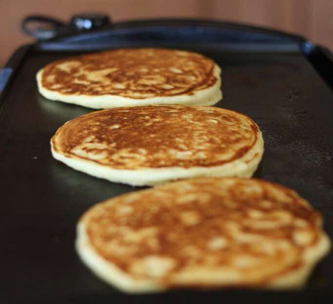 - Top with; Syrup, Peanut Butter, Jam, an Fried Egg, Fruit.