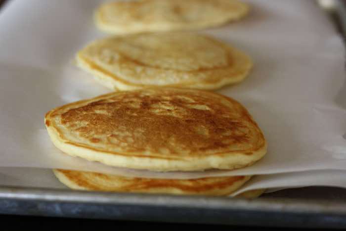 - Allow for pancakes to cool completely after cooking. Then line a cookie sheet with parchment and place pancakes on sheet without touching each other. Add another layer of parchment and layer again with pancakes until all the pancakes are flat and ready to freeze. If you’re wondering why you have to wait for the pancakes to cool completely it is because if not, it will cause freezer burn!