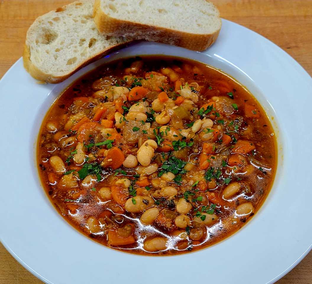- Reduce the heat to low, cover the pot, and simmer for 1.5 to 2 hours, stirring occasionally, until the beans are tender and the soup has thickened slightly.
