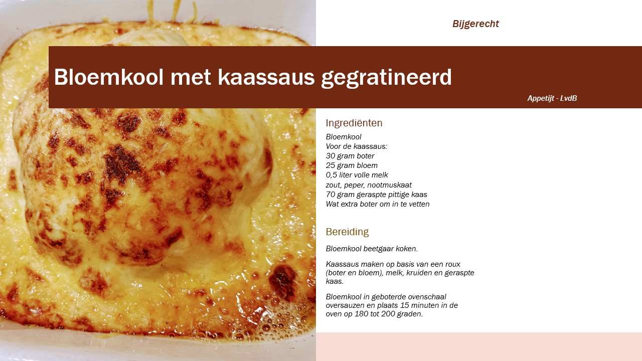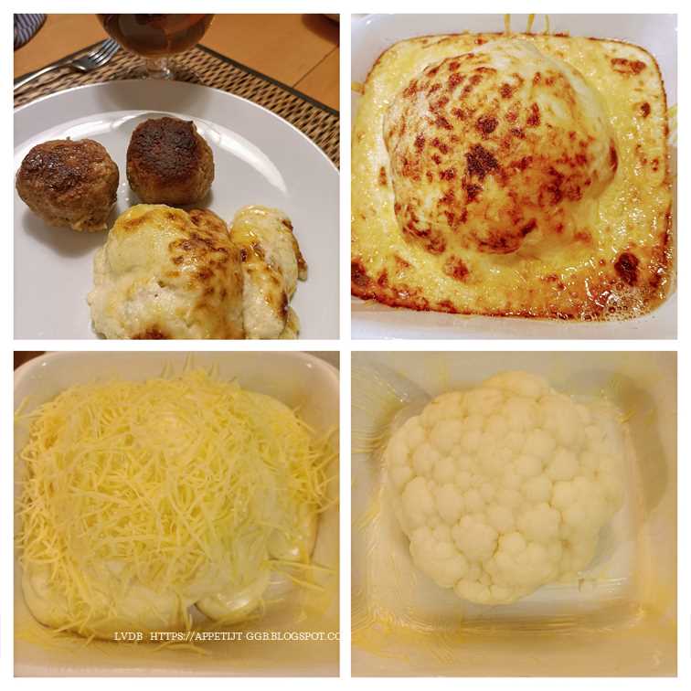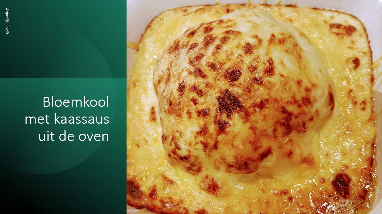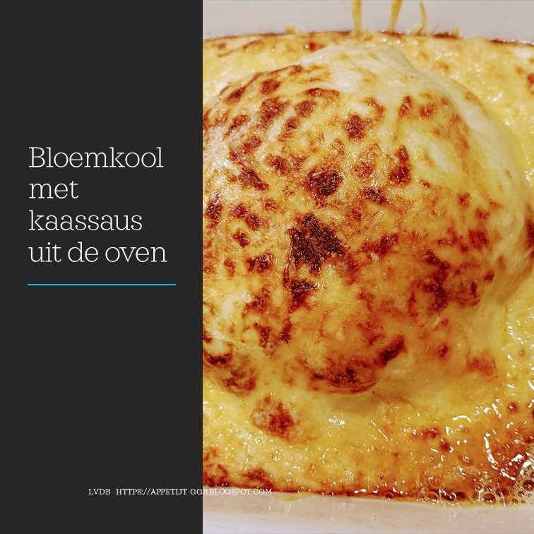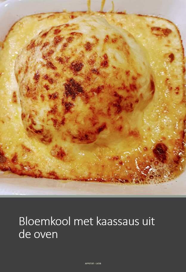 - Schik de bloemkool in een licht geboterde ovenschaal en bedek met de kaassaus. Strooi de rest van de saus er over heen.