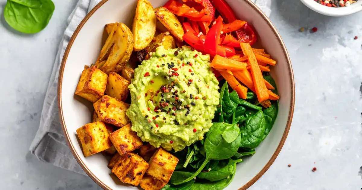 - 5. Bowl anrichten: Babyspinat, geraspelte Karotten und Paprikastreifen in einer Schüssel anrichten. Ofenkartoffeln und knusprigen Tempeh darauf verteilen. Mit der Avocado-Creme garnieren und servieren.