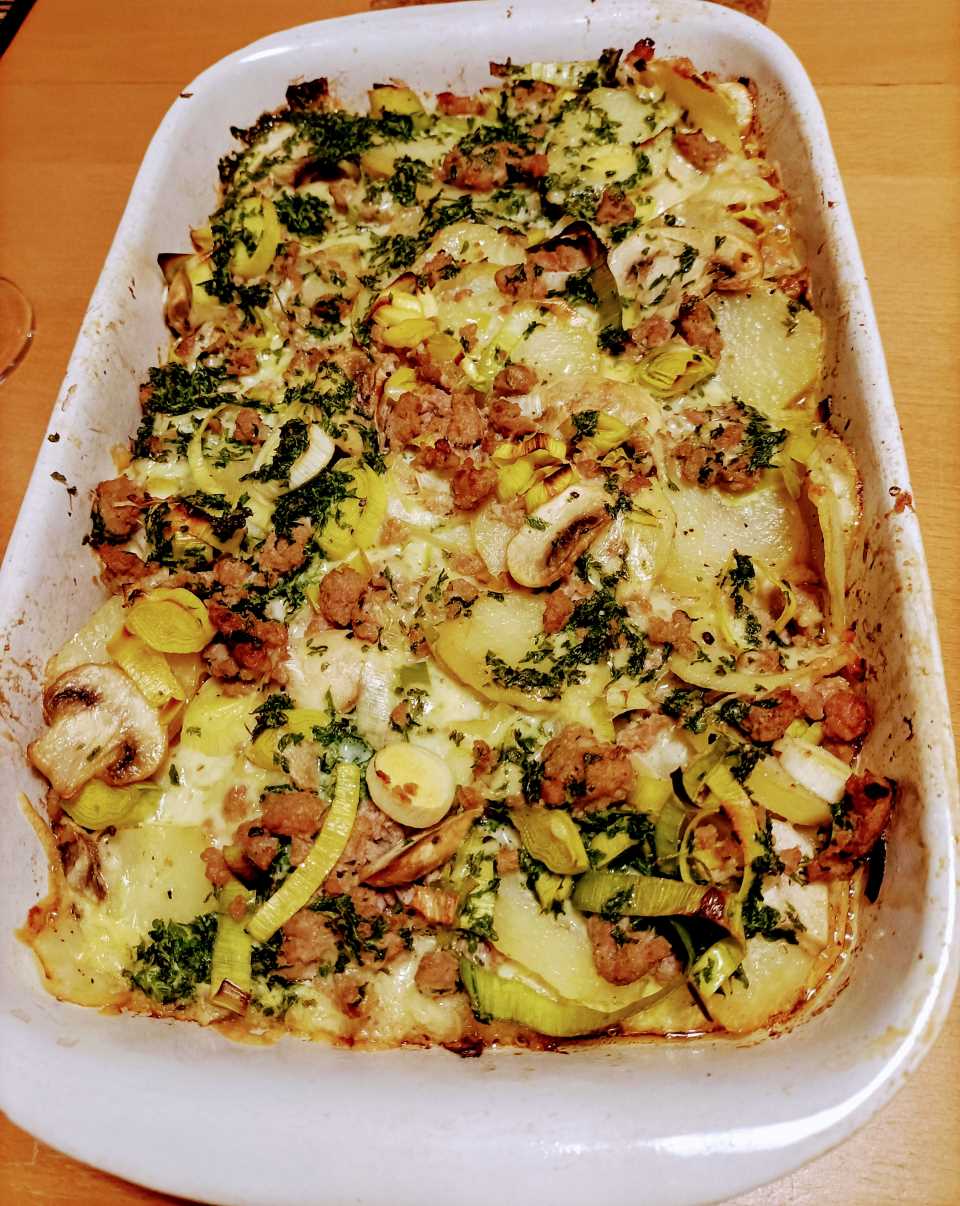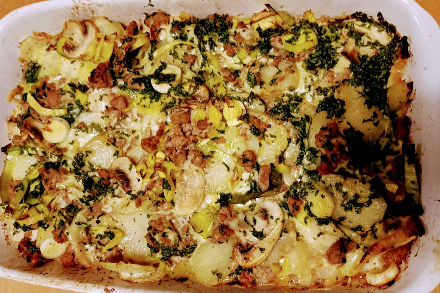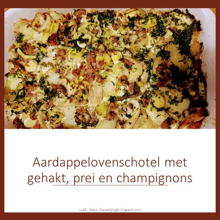 - Haal na 15 minuten de ovenschaal met aardappelen uit de oven, doe de helft van het gehaktmengsel er op, dan een laagje geraspte kaas (niet te veel), daarop het laatste deel van get gehaktmengsel, weer een laagje kaas en daarover heen het eiermengsel.