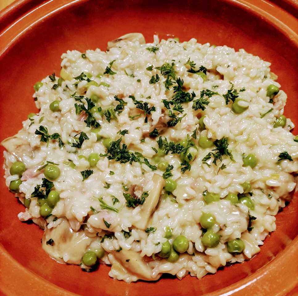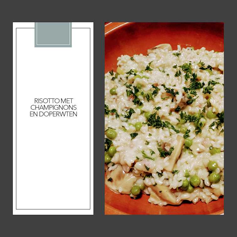 - 1/3 van de bouillon toevoegen en eveneens regelmatig roeren aan de kook laten komen tot het meeste vocht is opgenomen. Voeg de resterende bouillon op dezelfde manier in twee fases toe en bij het laatste derde van de bouillon voeg je ook de doperwten toe.