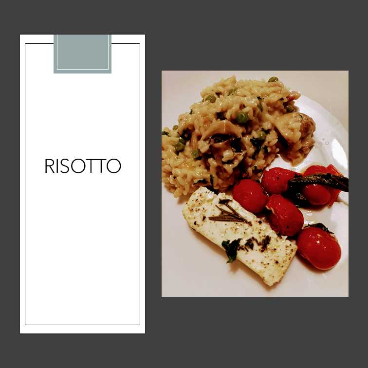 - Olijfolie en boter verhitten en hierin de ui, spekblokjes en rijst al roerend zachtjes bakken.