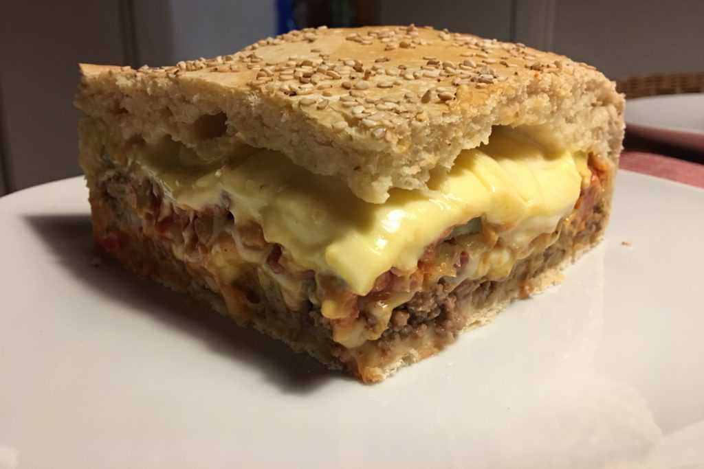 - Die angebratene Hack-Bacon-Zwiebel-Mischung auf den Teig geben und die weiteren Zutaten darauf verteilen: Tomatenketchup, Senf, Gewürzgurken (in Scheiben) und viiiiel Käse. Die Zutaten dürfen auch gerne geschichtet werden.