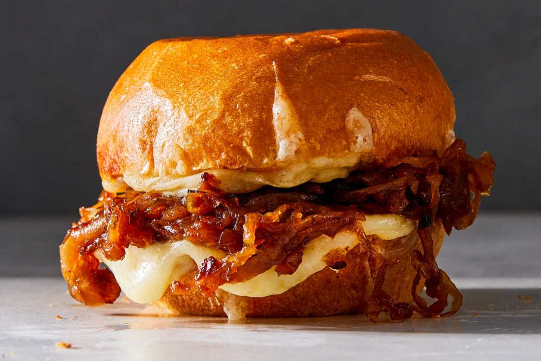 - 3. Heat the oven to broil (on low, if possible). Place the halved brioche buns open on a sheet pan. Divide the cheese evenly among each bun half and broil until melted, 3 to 4 minutes. Remove the buns from the oven and sprinkle with ground black pepper. Add caramelized onions (about 2 tablespoons) to the bottom half of each bun. Sandwich the two halves and serve.
