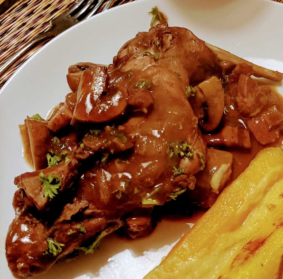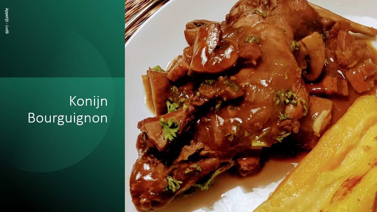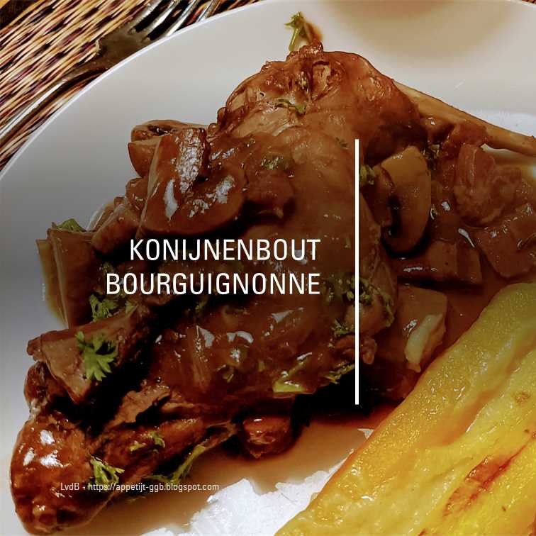 - Konijn, voor dit recept konijnenbouten in rode wijn met ui, spekjes en champignons.