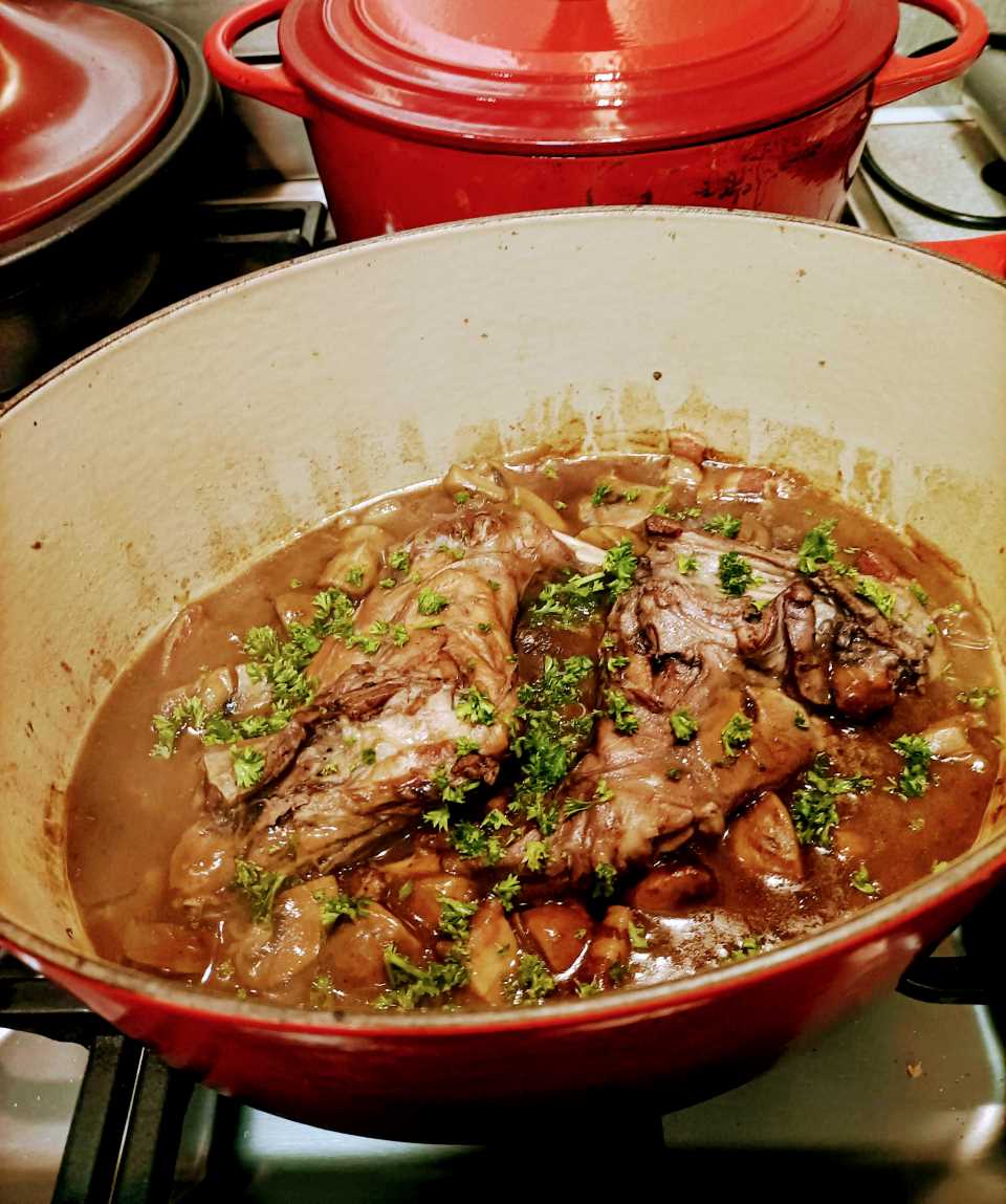 - Leg de konijnenbouten terug in de saus en laat nog een tiental minuten zachtjes sudderen.
