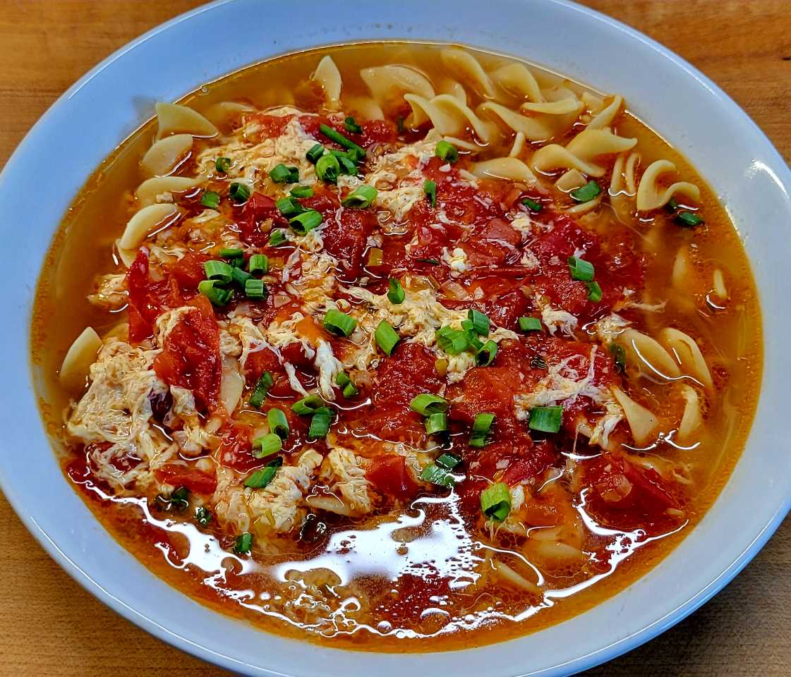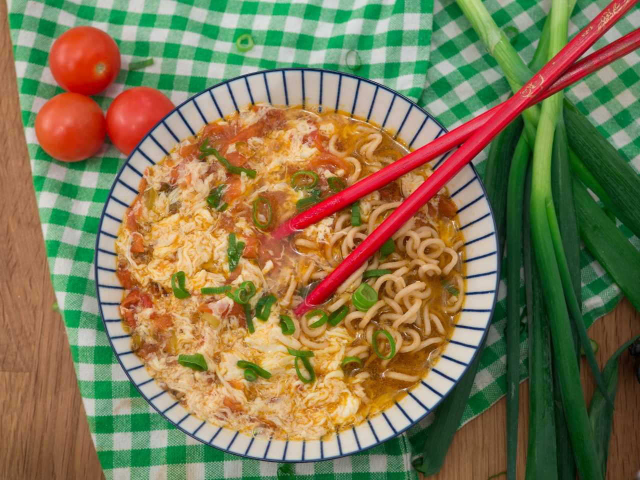 - Prepare some noodles. In a small soup plate add some noodles and pour over some of the tomato soup. Top with the chopped scallion greens. You can also add other topping like chopped shallots, cilantro or similar.