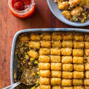 - 6. TO MAKE AHEADAt end of step 2, let beef mixture cool completely, then cover with aluminum foil and refrigerate for up to 24 hours. To serve, bake beef mixture, covered, until hot in center, 15 to 20 minutes. Remove foil, stir beef mixture, sprinkle with peas and corn, arrange tater tots on top, and bake as directed in step 3.