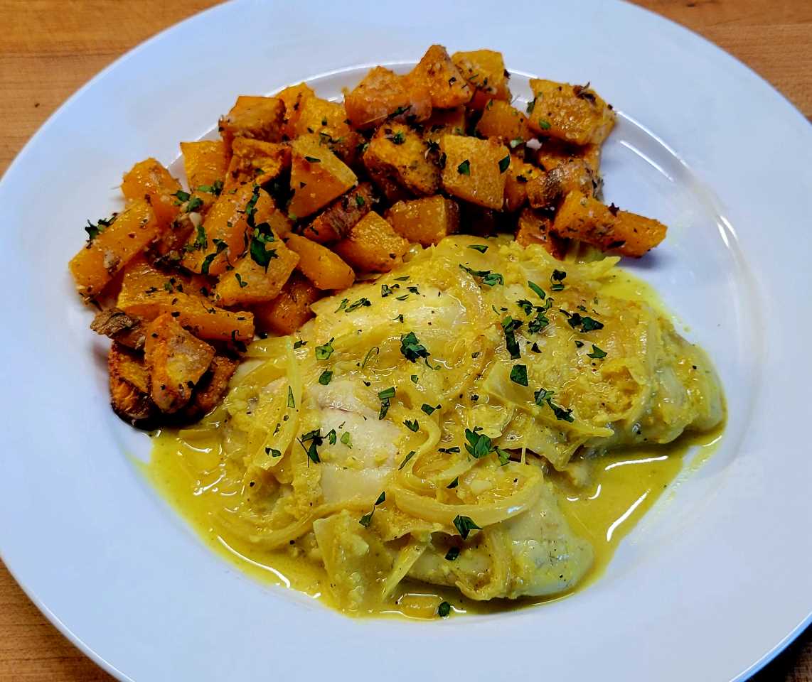 - Sauté onions, garlic, and ginger. Add turmeric, then coconut milk. Simmer fish until cooked. Garnish with cilantro.