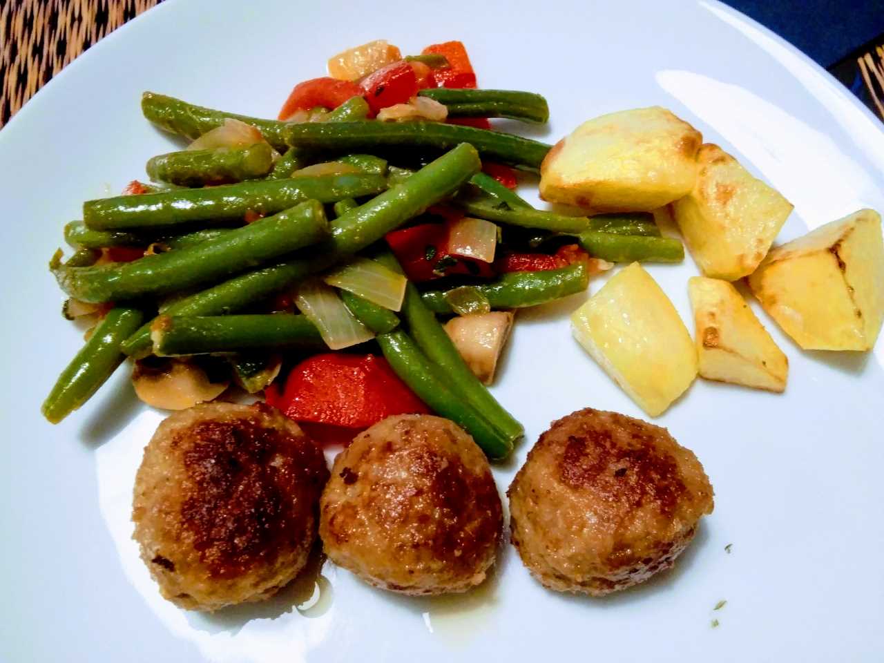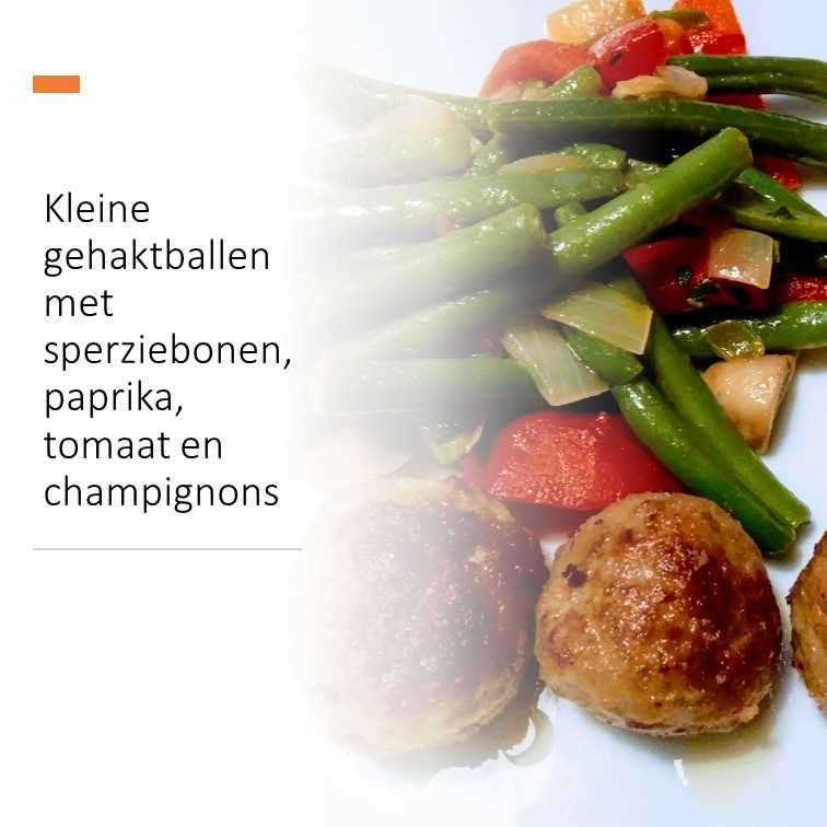 Kleine gehaktballen met sperziebonen, tomaat, paprika en champignons
