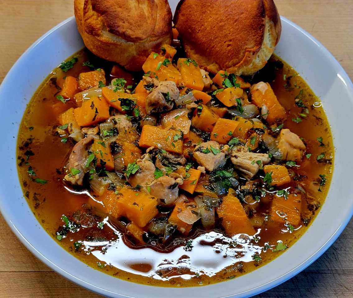 - Meanwhile, peel the root vegetables and cut into bite-size pieces.