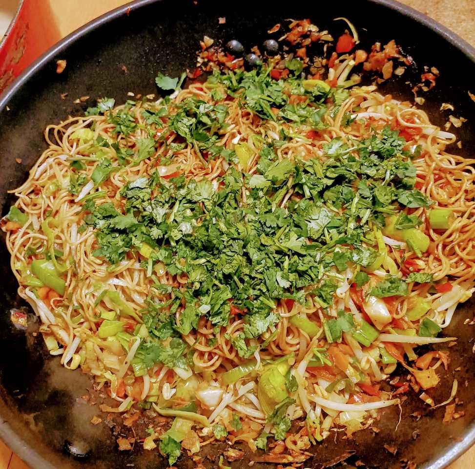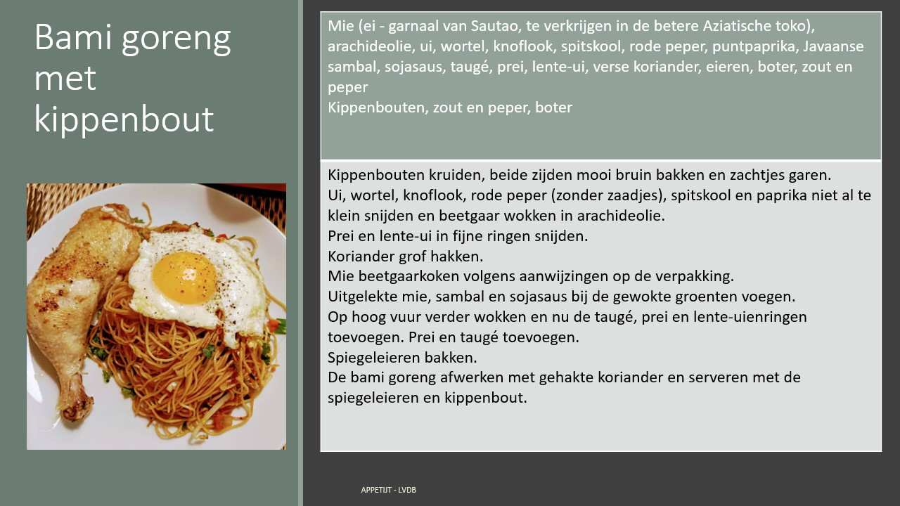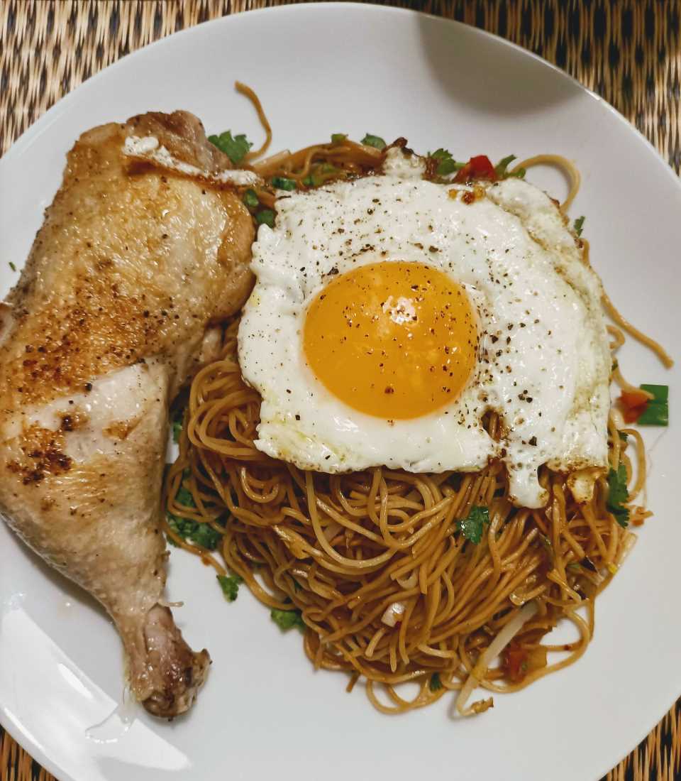 - De bami goreng afwerken met gehakte koriander en serveren met de spiegeleieren en kippenbout.