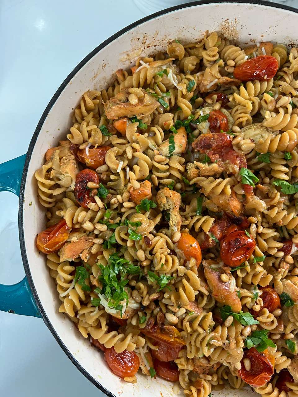 - Once pasta is finished cooking, add to pan with chicken. Add 1/2 cup of the that reserved pasta water and pesto. Stir until well combined. Add cherry tomatoes, pine nuts, Parmesan cheese and chopped parsley.