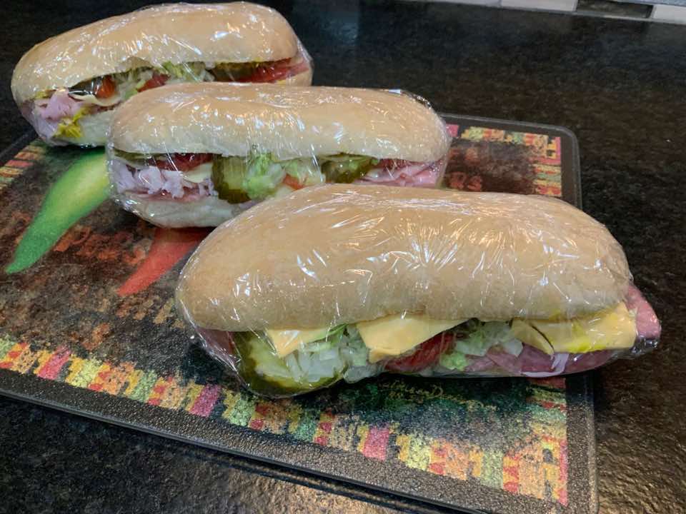 - 4. BOTTOM BUN: 4 salami halves. 2 bologna halves. 2 cheese slices. 2 ham halves. 4 tomato slices. Shredded lettuce. 4-8 pepper rings.