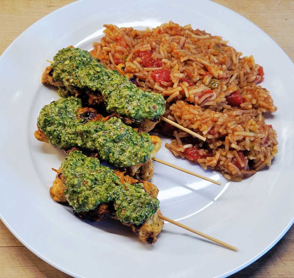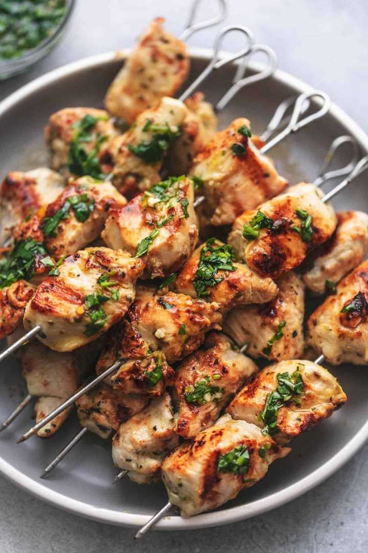 - Skewer chicken pieces and discard excess marinade.