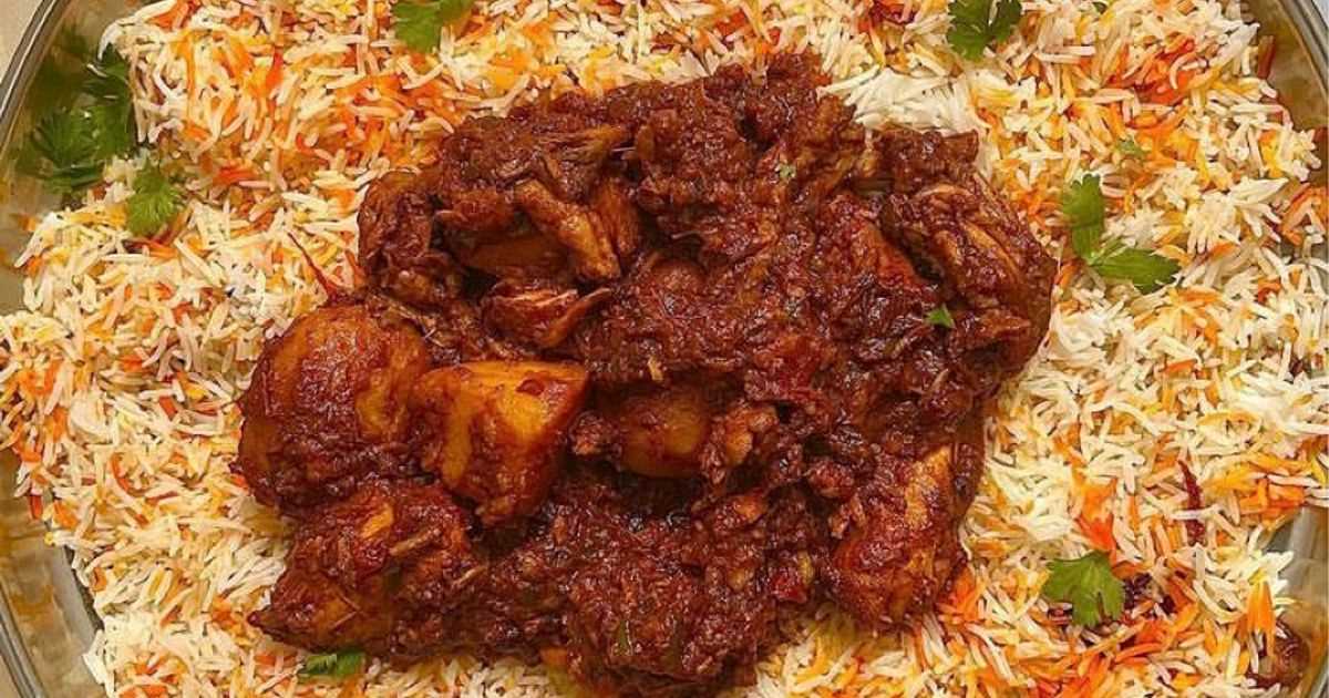 - Once masala is cooked through layer the rice over it(optional) drizzle saffron and rose water,remaining fried onions and extra biryani masala on top