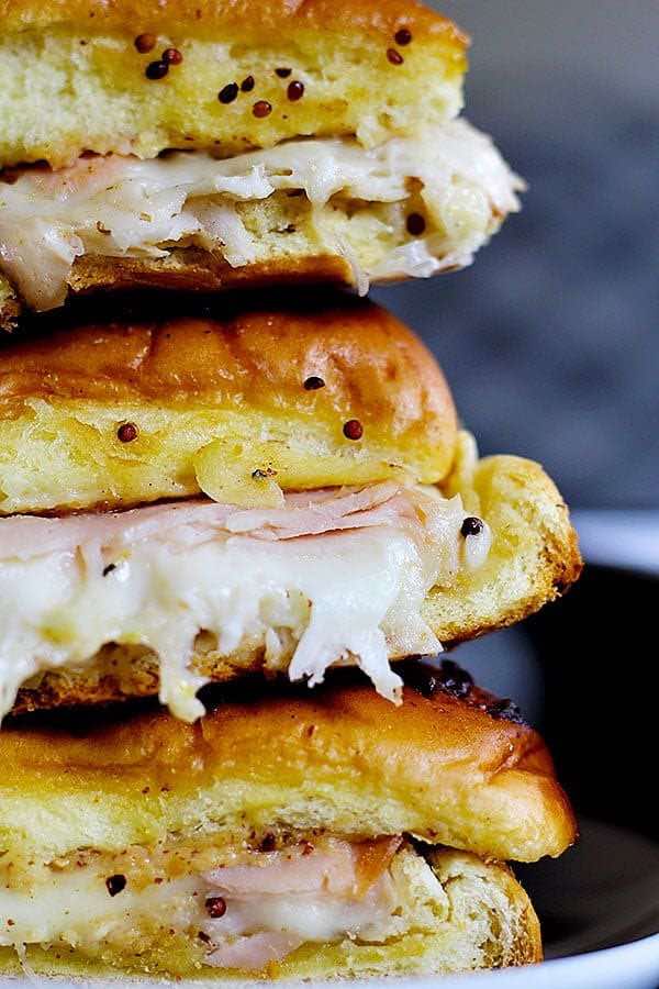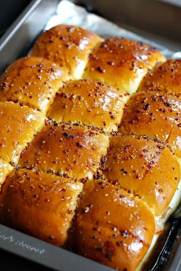 - * To make this recipe ahead of time, assemble the sliders as instructed, wrap them in layers of plastic wrap and freeze for up to 2 months. To bake, unwrap them and place them on a baking sheet. Brush with butter and mustard and bake at 350ºF for about 25 to ° minutes or until the cheese is melted.