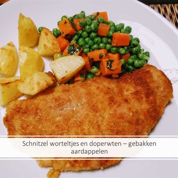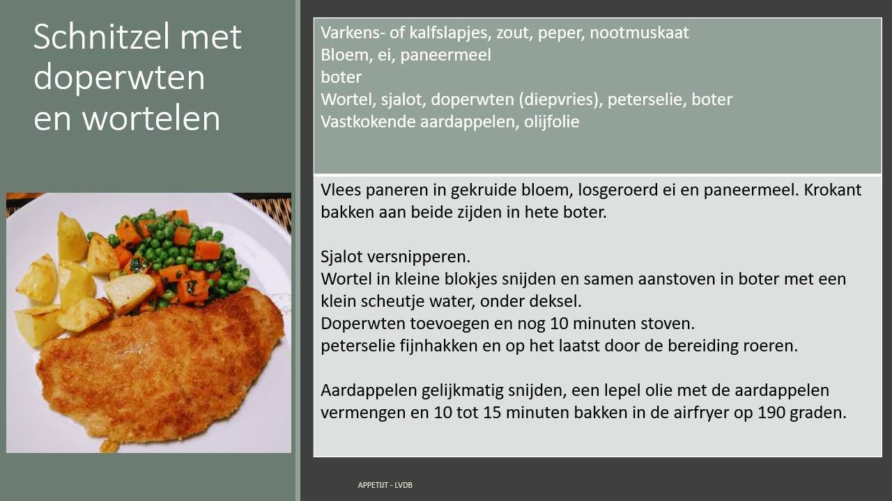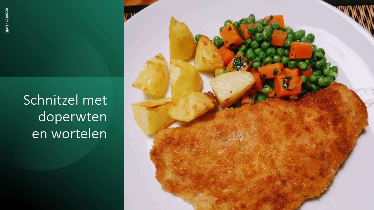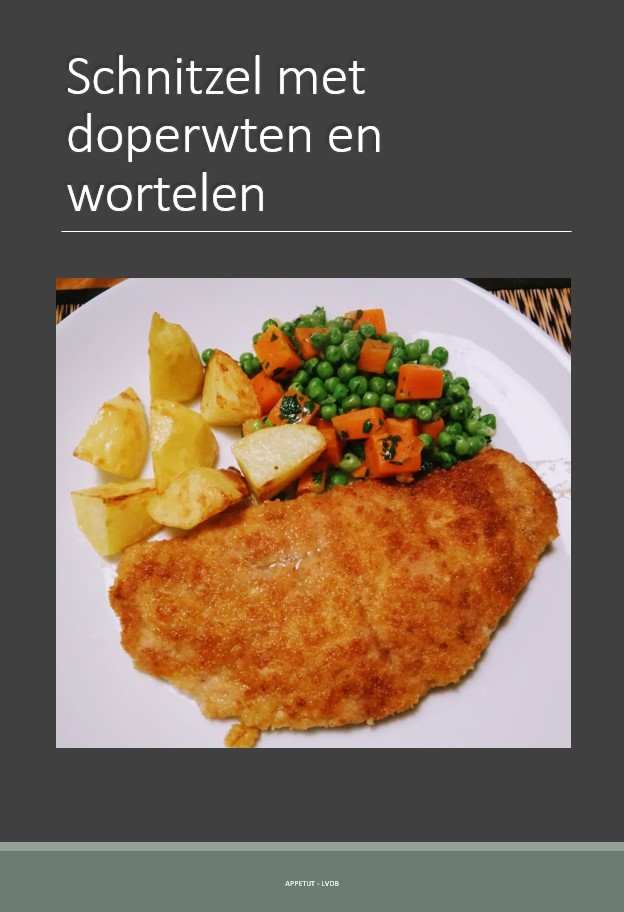 - Vlees paneren in gekruide bloem, losgeroerd ei en paneermeel. Krokant bakken aan beide zijden in hete boter.