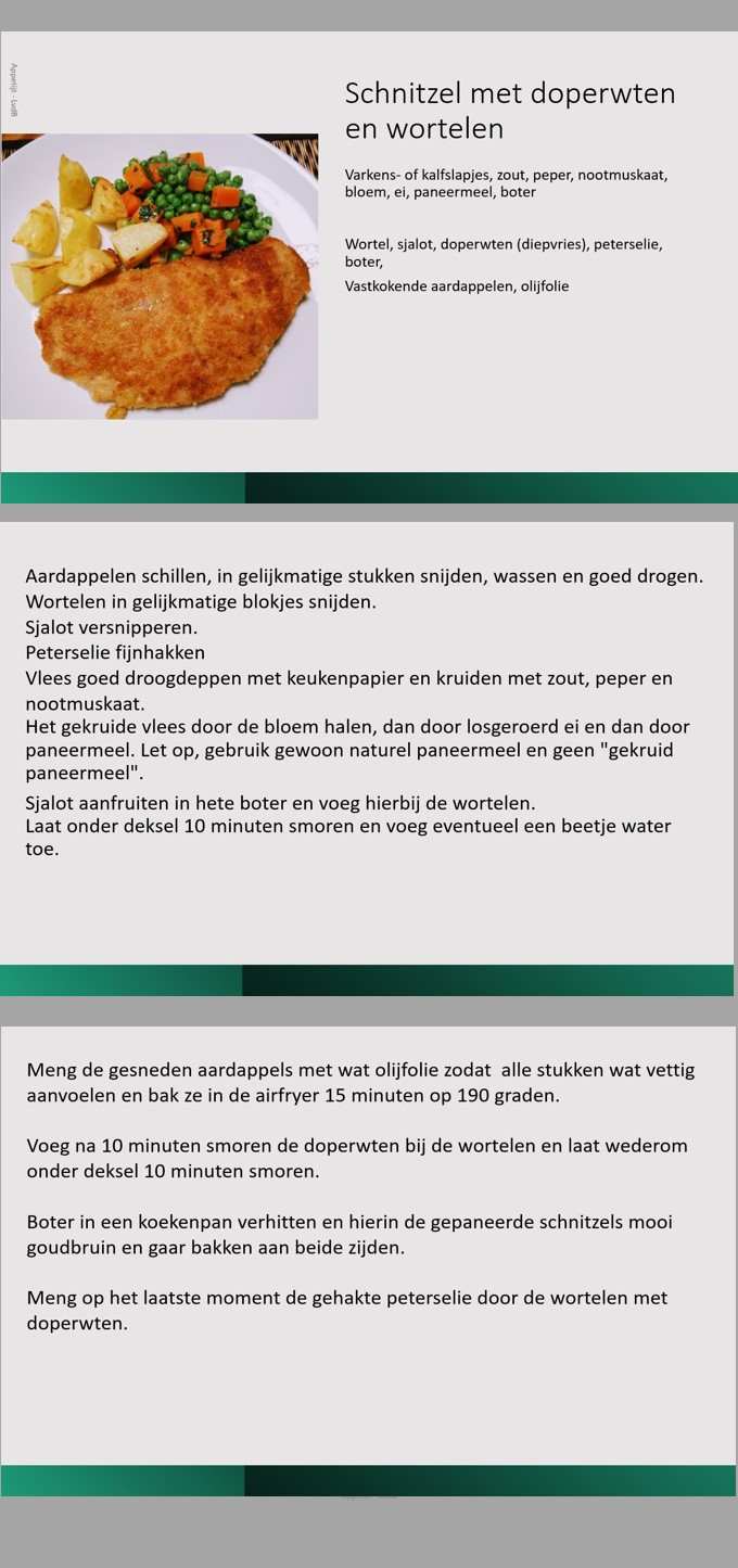 - Wortel, sjalot, doperwten (diepvries), peterselie, boter,