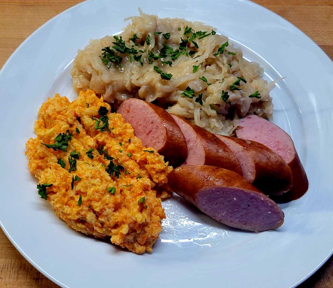 - Let the raspeballer simmer for about 30 minutes. If you're making smoked sausage, you can heat the sausage in the same pot with the raspeballer. Top with fresh chopped parsley.