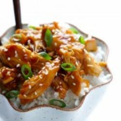- 2. In a separate bowl, whisk together the garlic, onion, honey, soy sauce, rice wine vinegar, ginger, and black pepper until combined. Pour the mixture on top of the chicken breasts. Cover slow cooker, and cook on high for 4-5 hours, or until the chicken is cooked through and shreds easily with a fork. Remove the chicken with a slotted spoon to a separate bowl and shred it using two forks. Transfer the remaining teriyaki sauce from the slow cooker to a medium saucepan.