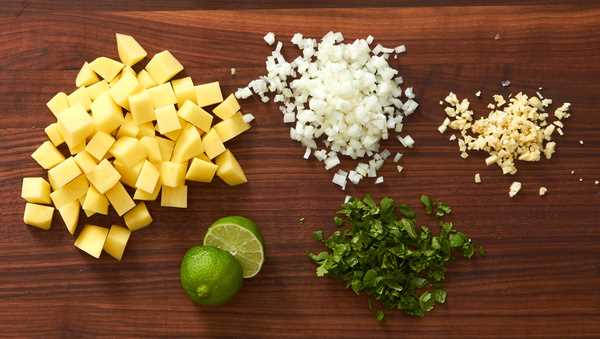 - Preheat oven to 450°F. Peel potatoes and cut into ½-inch cubes. Halve lime. Rinse cilantro and roughly chop, discarding stems. Peel onion, halve, and cut into small dice. In a small bowl, combine 2 tablespoons onion and 1 teaspoon spice mix and set aside until Step 5. Mince garlic.