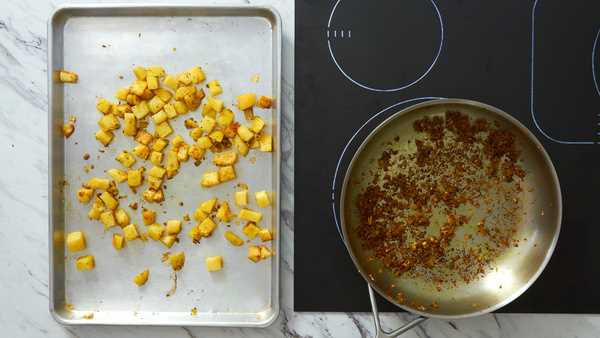 - On a baking sheet, toss potatoes with 1 tablespoon olive oil, ½ teaspoon salt, and black pepper, arrange in a single layer, and roast until lightly browned, 14-16 minutes. Meanwhile, heat 1 tablespoon olive oil in a medium pan over medium-high heat. When oil is shimmering, add garlic, remaining onion, remaining spice mix, and ¼ teaspoon salt, and cook until softened, 3-4 minutes, then remove from heat.