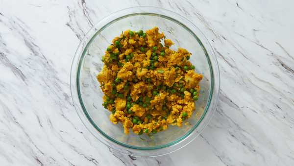 - Once roasted, add potatoes and 2 tablespoons water to pan with aromatics, reserving baking sheet for Step 5. Mash potatoes with a potato masher or a large fork until just combined (the filling should have some texture, so don't mash until smooth). Stir in peas and half of cilantro, then transfer to a large bowl. Wipe pan clean and reserve for wilting spinach.
