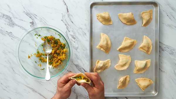 - Halve empanada doughs. Working 1 at a time, fold each dough in half to create a triangle, then pinch straight edge closed to seal. Spoon 1 tablespoon filling into each and pinch remaining edges closed, saving any extra filling for serving on the side. Rub samosas all over with 1 teaspoon olive oil, arrange on baking sheet from potatoes, and bake until golden brown, 11-13 minutes.
