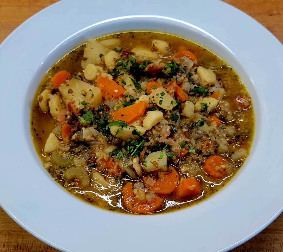 - Mince the garlic and finely dice the onion. Cut the carrots into rounds and cut the parsnips into half moons. Cut the potato into 1-inch chunks. Slice the celery into 1/3-inch slices.