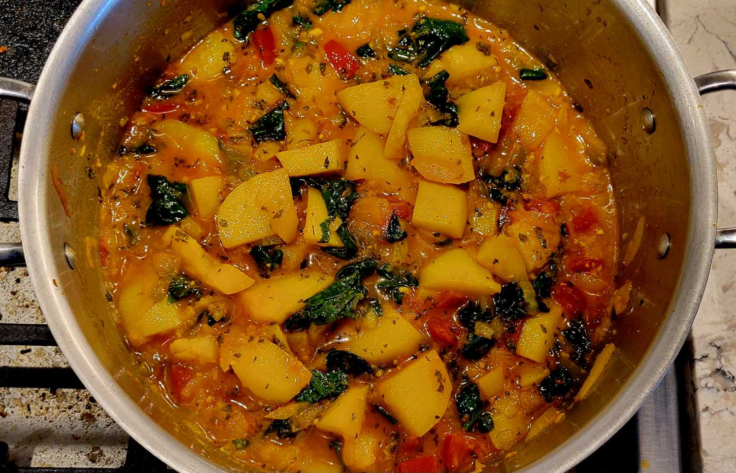 - Add in the chopped spinach. Simmer this covered with a lid on low for 5 minutes, then uncovered until the moisture from the spinach has been cooked out and there isn't any murky-coloured water left. Instead of stirring, swirl the pot as discussed in the recipe post to ensure the potatoes don't break,