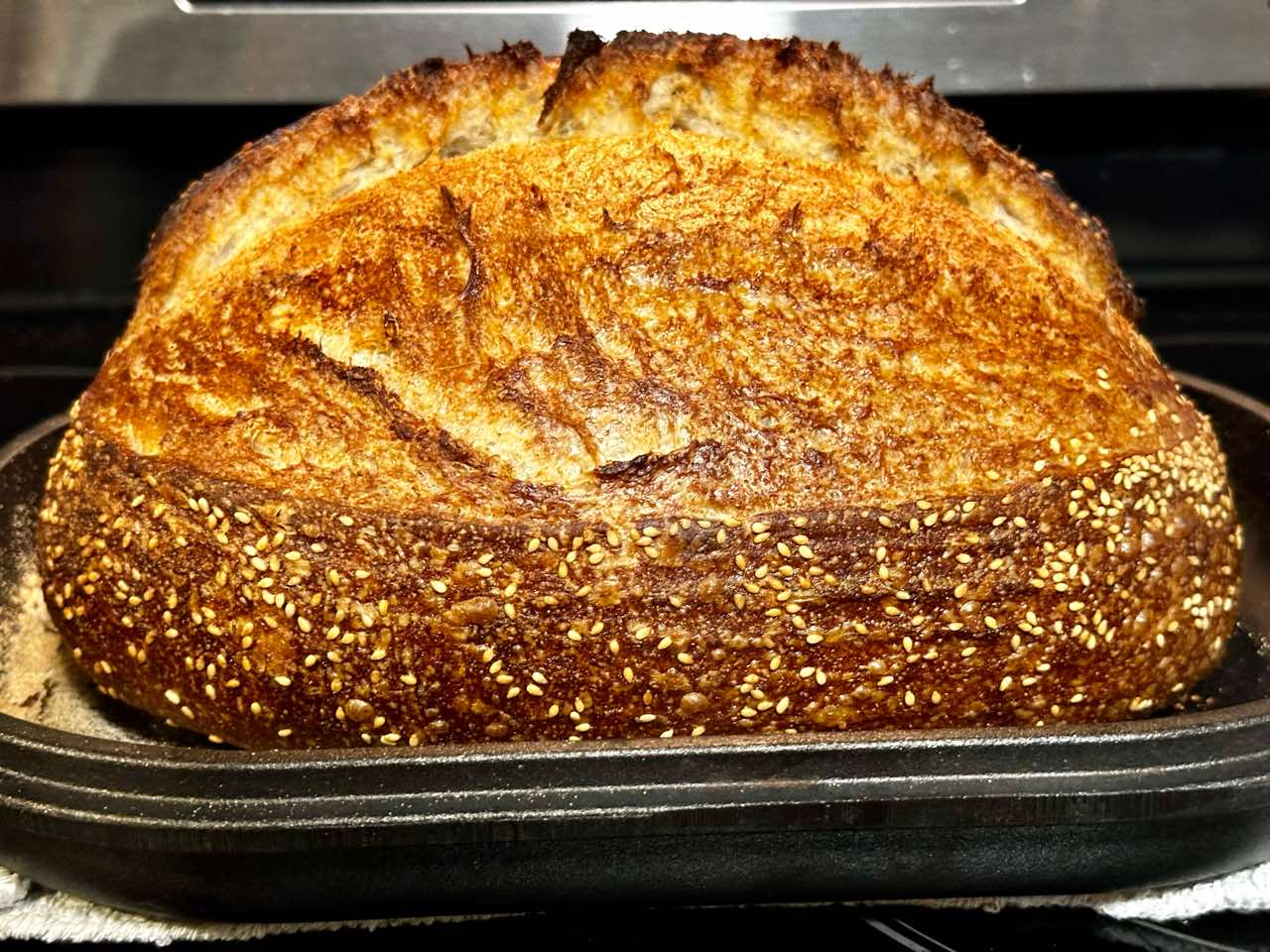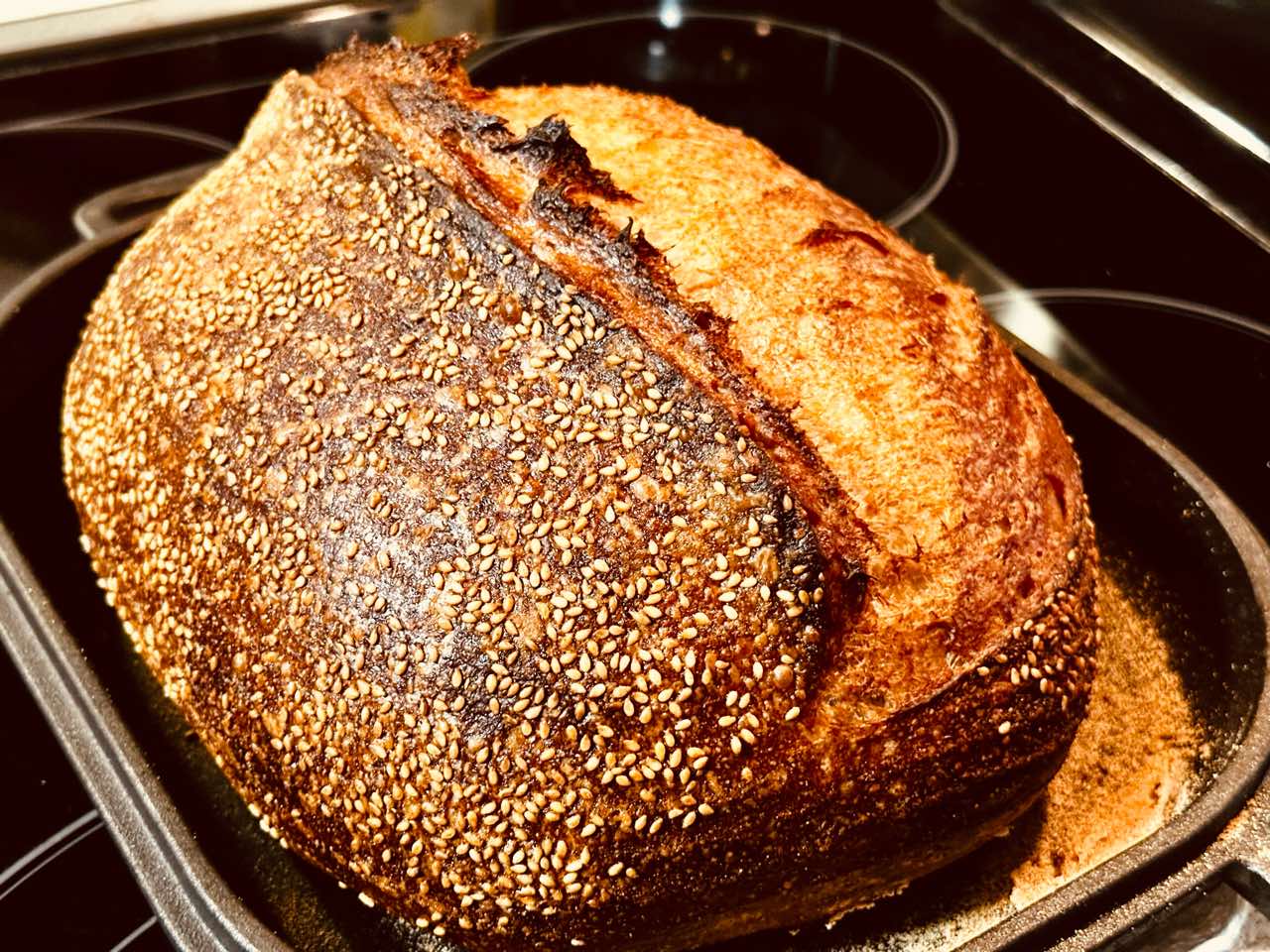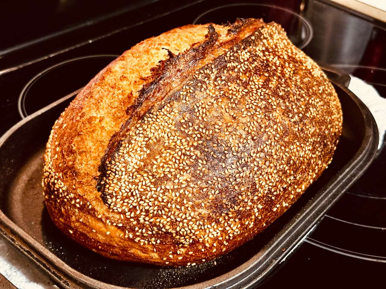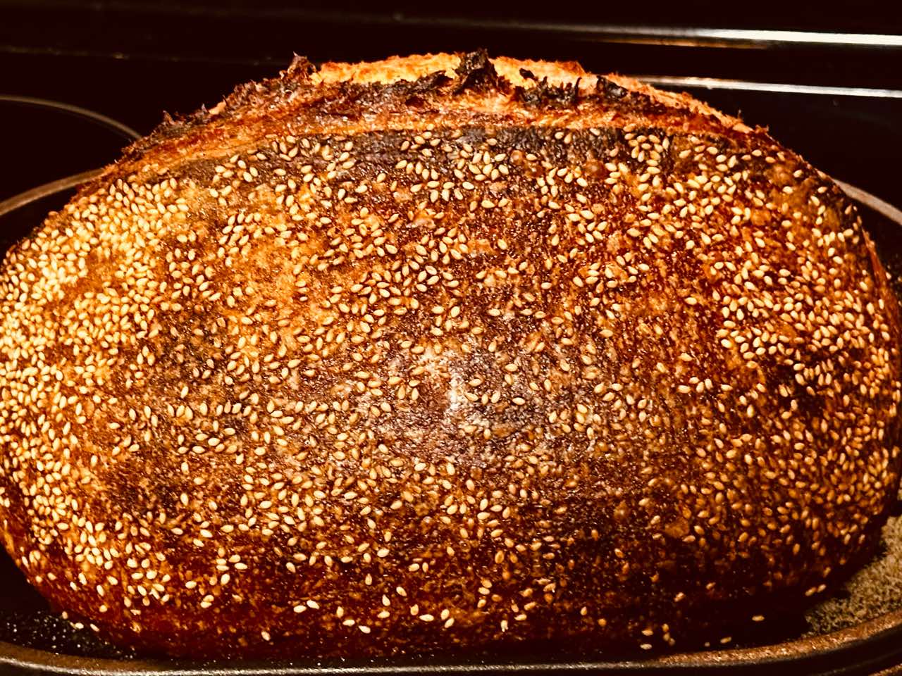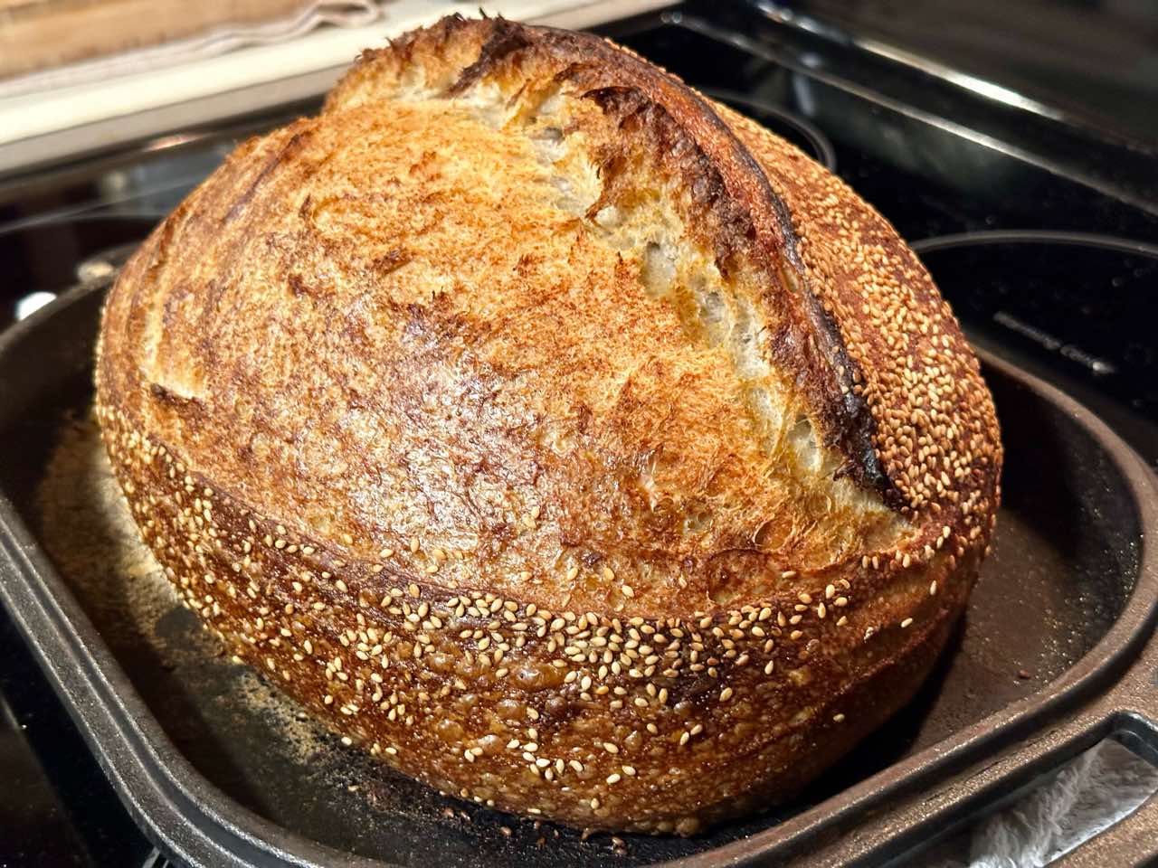 - 8. (Preheat oven at 8:30 a.m., bake at 9:30 a.m.)Preheat your oven with a combo cooker or Dutch oven inside to 450°F (230°C). When the oven is preheated, remove your dough from the fridge, score it, and transfer to the preheated combo cooker. Place the cooker in the oven, cover with the lid, and bake for 20 minutes. After this time, remove the lid (you can keep it in the oven or remove it) and continue to bake for 30 minutes longer. When done, the internal temperature should be around 208°F (97°C). Let the loaves cool for 1 to 2 hours on a wire rack before slicing.