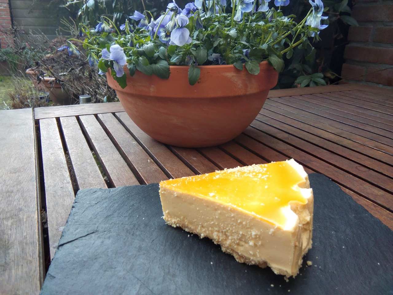 - Deze gelei op de kwarktaart doen en goed draaien zodat een dun geleerlaagje gevormd wordt.